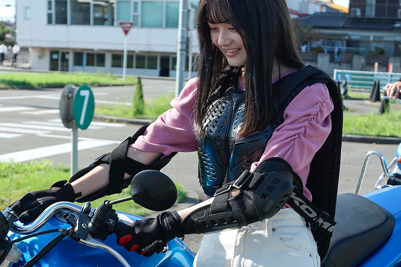 初回技能教習服装は長袖・長ズボン、二輪シューズ、ヘルメット、グローブなど忘れずに。 -